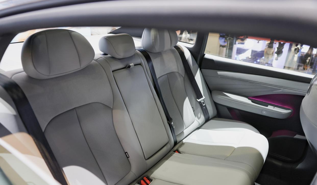 日产N6的车身很有辨识度,弧线形的车顶搭配着灵动的腰线设计,还有渐进式的黑色轮眉,再加上前低后高式的车身姿态,将轿跑的灵动性展现得淋漓尽致。车窗加入了黑色的饰条,四个门把手采用了隐藏触摸感应式设计,还加入了四个无边框车门,配备了18英寸的花瓣式低风阻轮圈中金汇融,毫无违和感。尺寸方面,全新日产N6的长宽高分别为4831/1885/1491mm,轴距为2815mm。对比日产N7尺寸明显更紧凑一些。车内采用了传统的5座布局,前后排都配备了沙发座椅,座椅内部集成了行业领先的49个高精度传感器,共同构成了一个灵敏的“电子皮肤”系统,传承了日常“大沙发”的精髓。