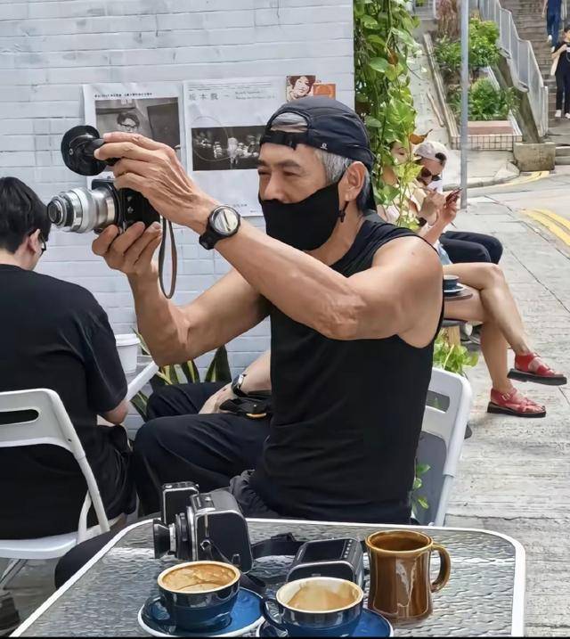这位70岁的影帝一头银发,带着鸭舌帽,穿着黑色无袖背心。