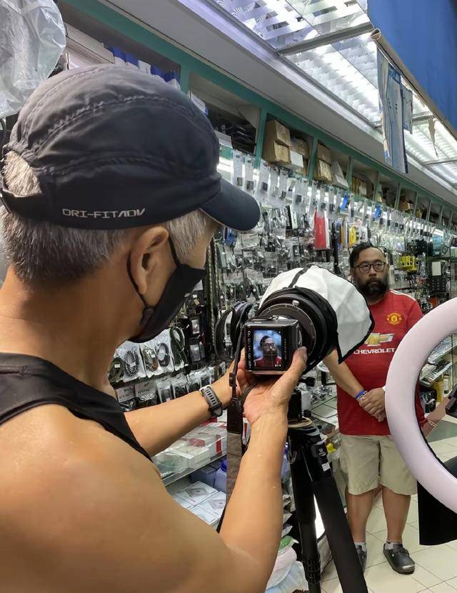 时不时还和朋友探讨摄影技巧,认真举着相机,眯着眼看角度。